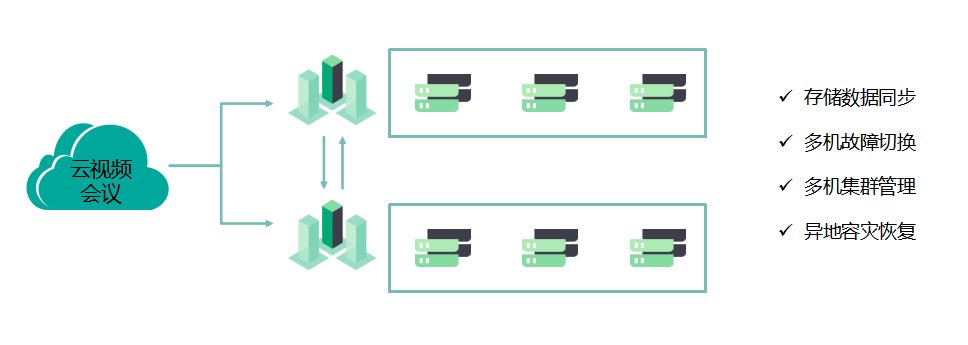 • 若单点异常故障,会议不会中断,并在20秒之内自动迁移到可用服务器;