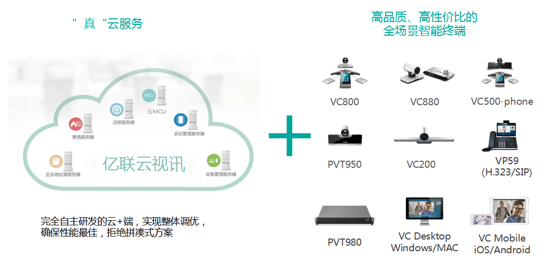 亿联云视讯是一个基于云架构的支持多方视频会议的服务平台,集云MCU、注册、穿透、会议管理、会议控制、设备管理等服务模块于一体,并支持亿联视频会议终端、桌面视频话机、PC软终端、移动APP等亿联全系列视频会议产品。