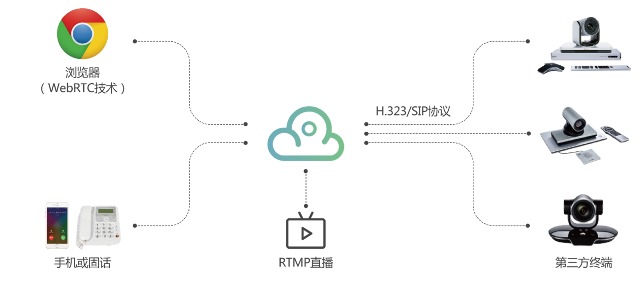 采用最先进的分布式架构,全球分布多个节点,多点多机热备,有极好的扩展性能;功能丰富,支持全编全解,支持多分组会议及大容量会议,支持会议预约与即时会议;且简单、易用、易部署、易维护,稳定可靠安全,适用于各种企业或行业用户。