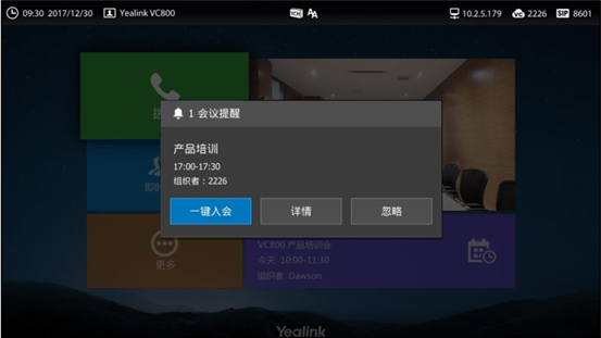 • 终端到点弹出会议提醒,并实现一键入会。入会不用再输出任何的IP地址,会议ID,会议密码;