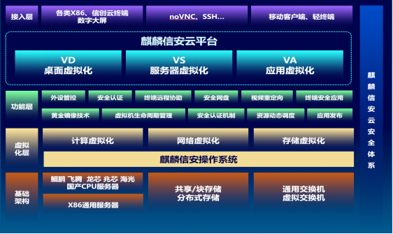 针对行业应用需求,麒麟信安创新性地将服务器虚拟化、桌面虚拟化和应用虚拟化3类主流虚拟化功能通过麒麟信安云中合而为一。麒麟信安云融合虚拟化,是在当今信息化建设发展趋势下为满足数据中心大集中整合思路而形成集服务器虚拟化、桌面虚拟化、应用虚拟化三种虚拟化技术路线于一体的,并实现资源异构条件下平台、生态、场景等多形态融合的关键技术和解决方案。该技术能够基于一套硬件、一套软件,构建一个服务集群,同时提供服务器虚拟机、桌面虚拟机和应用虚拟化服务,实现资源异构条件下平台、生态、场景等多形态融合,为用户提供一揽子的云计算服务解决方案。